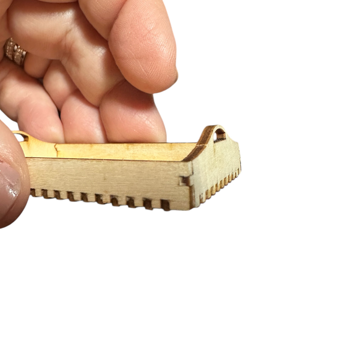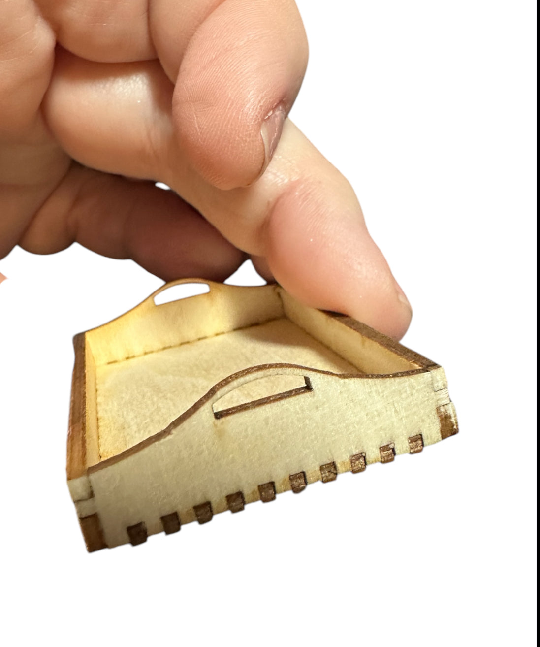Cute little Hand-Made ( Laser Cut) Trays. Able to be painted or stained, They will hold your mini decor, plants, books, or whatever else you choose to use them for. Dovetailed fit, no glue, handles and curved detail.